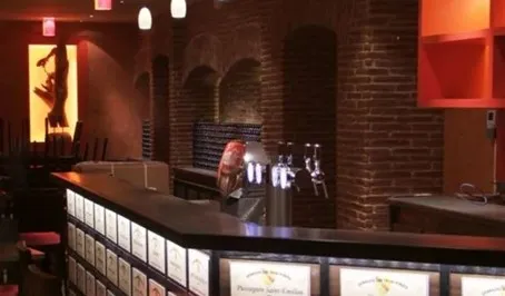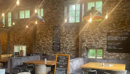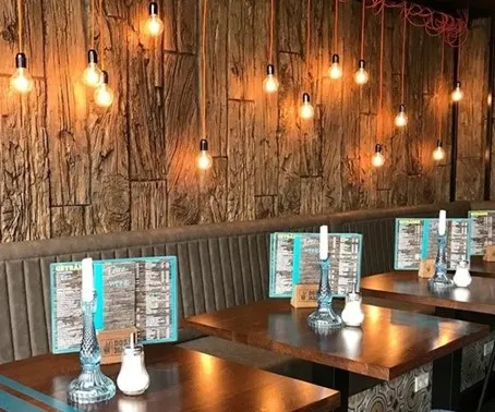 Pour une brasserie, un café ou une salle chaleureuse, la pierre Lajas et le bois mural créent un cadre plus enveloppant.