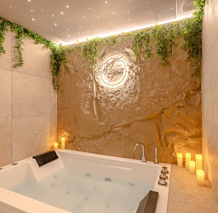 Mur en roche naturelle installé dans un spa Airbnb pour créer une ambiance relaxante, authentique et durable, parfaitement adaptée aux environnements humides.