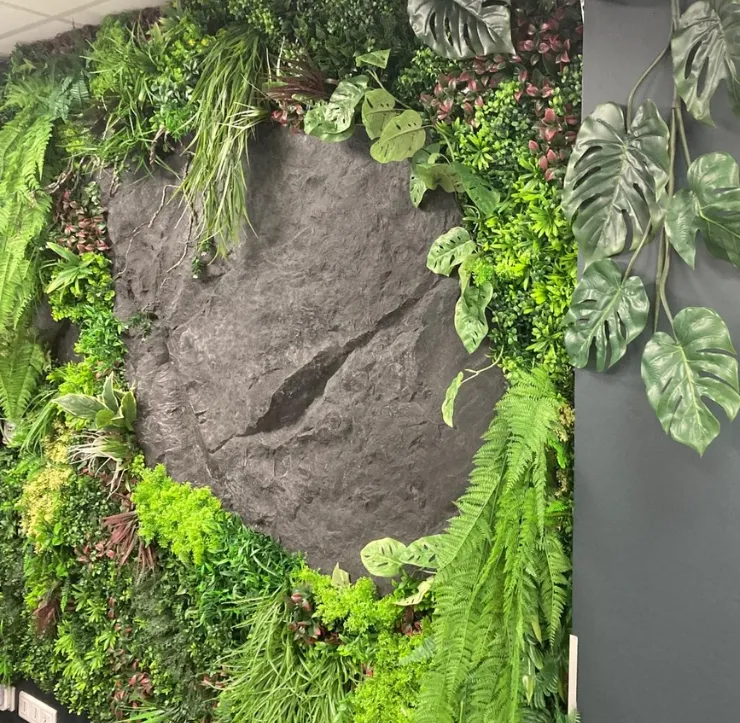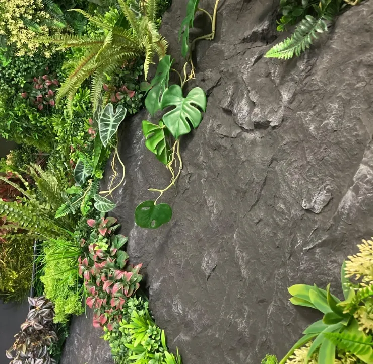 Le relief prononcé de la roche apporte de la profondeur au mur d’accueil et crée un décor fort, en cohérence avec l’univers sportif.